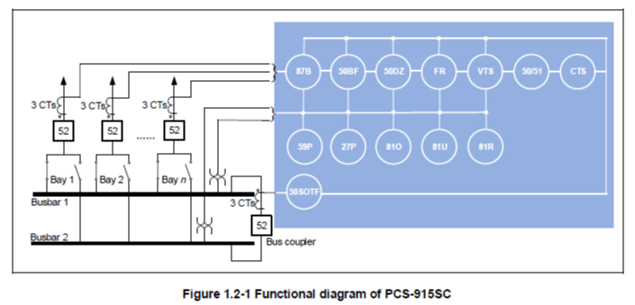 PCS-915SC centralized busbar relay integrates busbar differential protection, bus coupler/section protection (includes overcurrent protection, switch-onto-fault protection, dead zone fault protection, dual CTs BC/BS dead zone differential protection and breaker failure protection), feeder protection (includes overcurrent protection, dead zone fault protection and breaker failure protection), voltage protection (phase overvoltage protection and undervoltage protection) and frequency protection (overfrequency protection, underfrequency protection and frequency rate-of-change protection). With its flexibility and the powerful PCS-Studio configuration tool, PCS-915SC offers future-oriented busbar solutions with high investment security and low operating costs.